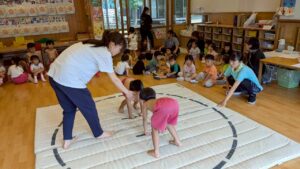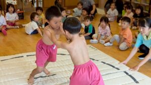 今日からおすもうの練習が始まり、 今日は、パンダこあら組さんとひつじ組さんの お手本として頑張りました👐🏼🐼🐨🐑 礼の仕方やお返事の声、 お友達の押し方などしっかり出来ました😌🎶 これからお外の土俵でも練習が始まります。 がんばろーね💪🔥