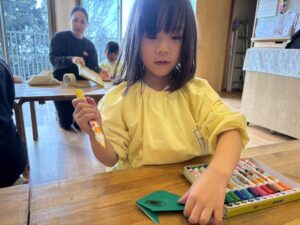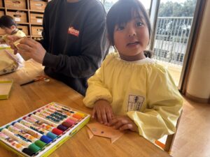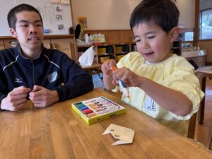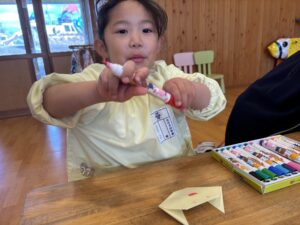 その後、お兄さんお姉さんが折ってくれた猫をみんなで顔を描いたよ☀️