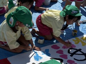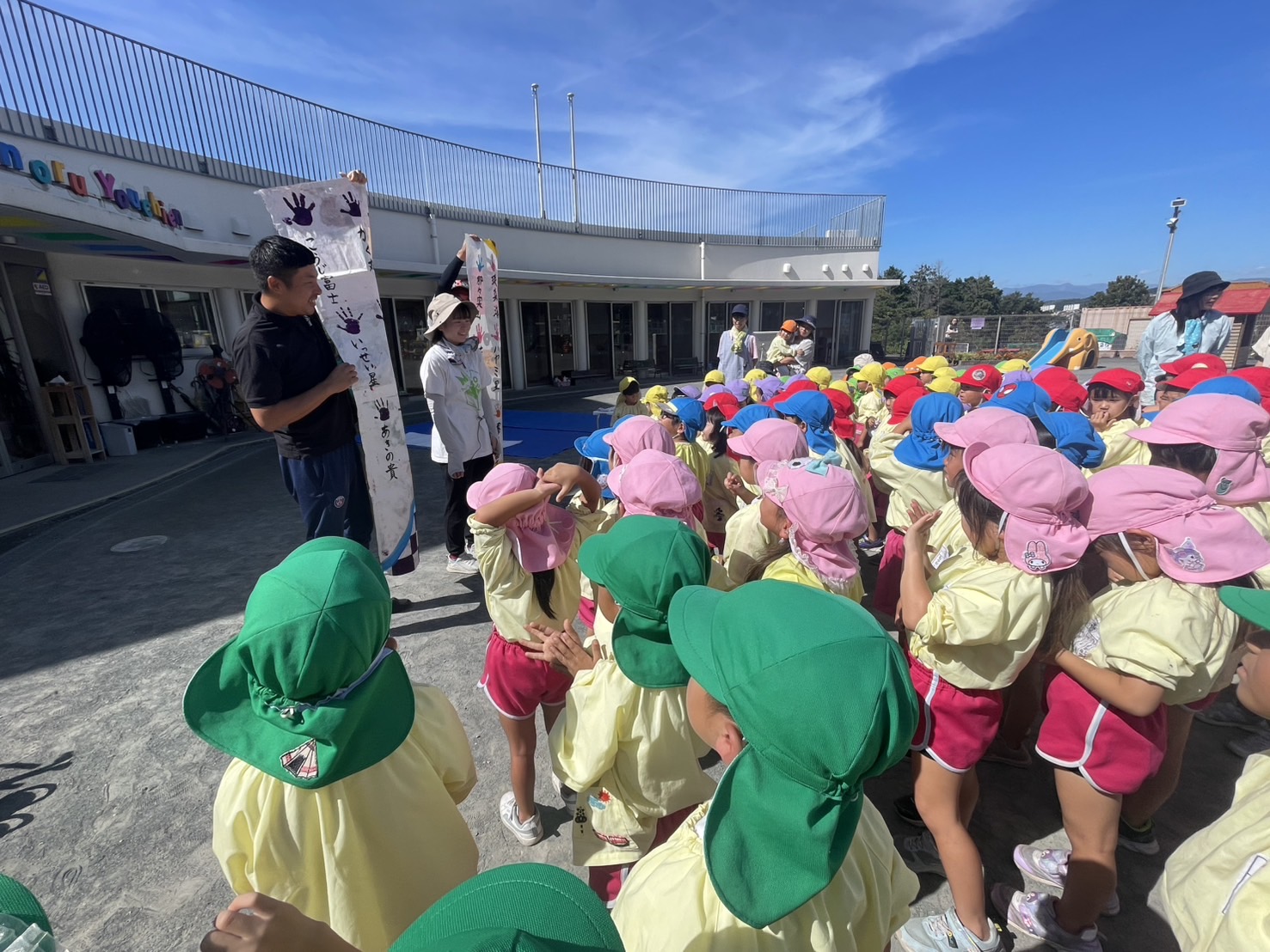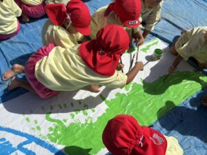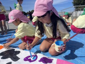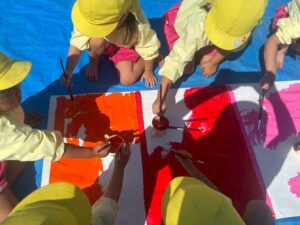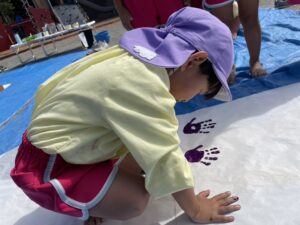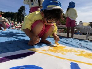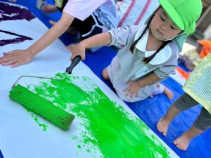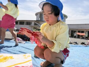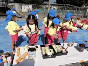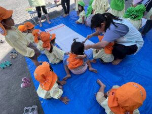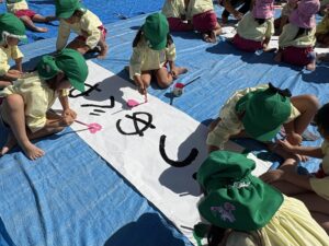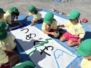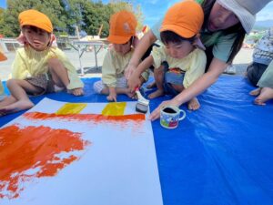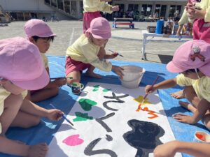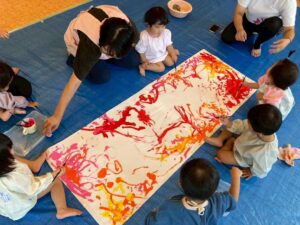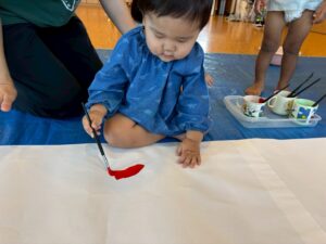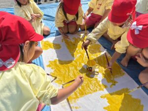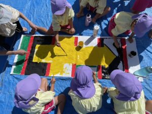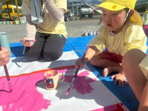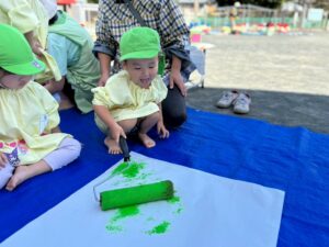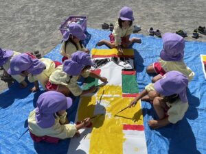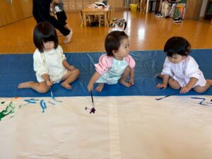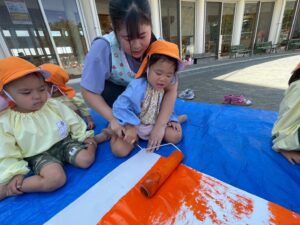 今日は来週のおすもう大会に向けて、のぼり旗作りをしました🎌 乳児はクラスで1枚、幼児はクラスで2枚ずつ旗を作りました😊それぞれどういう旗にするのかなど決めながら、素敵なのぼり旗が完成しました🫶🏻 ローラーやはけ、ラップを使ったり、手形をつけたり、、カラフルです🌈 表にクラス、裏に名前が書いてあったりと素敵な旗ができたので、お迎えの際やおすもう大会の日にぜひ見て下さい😌🤙🏻♪