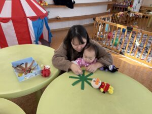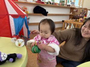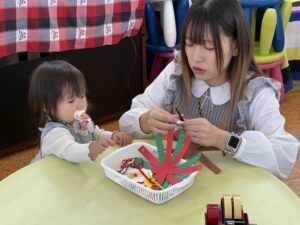 クリスマスカラーの毛糸に通してかわいいガーランドができたね