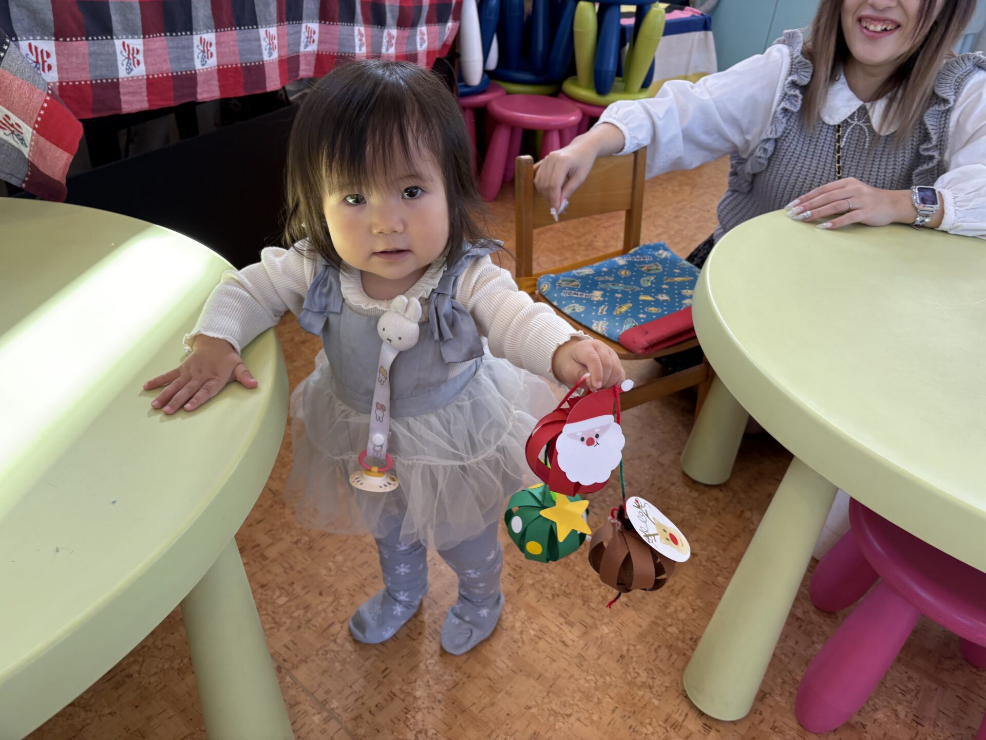クリスマスカラーの毛糸に通してかわいいガーランドができたね