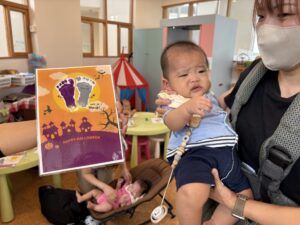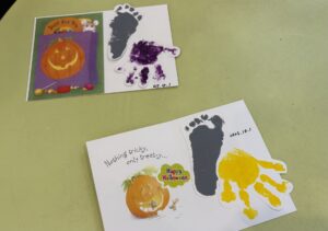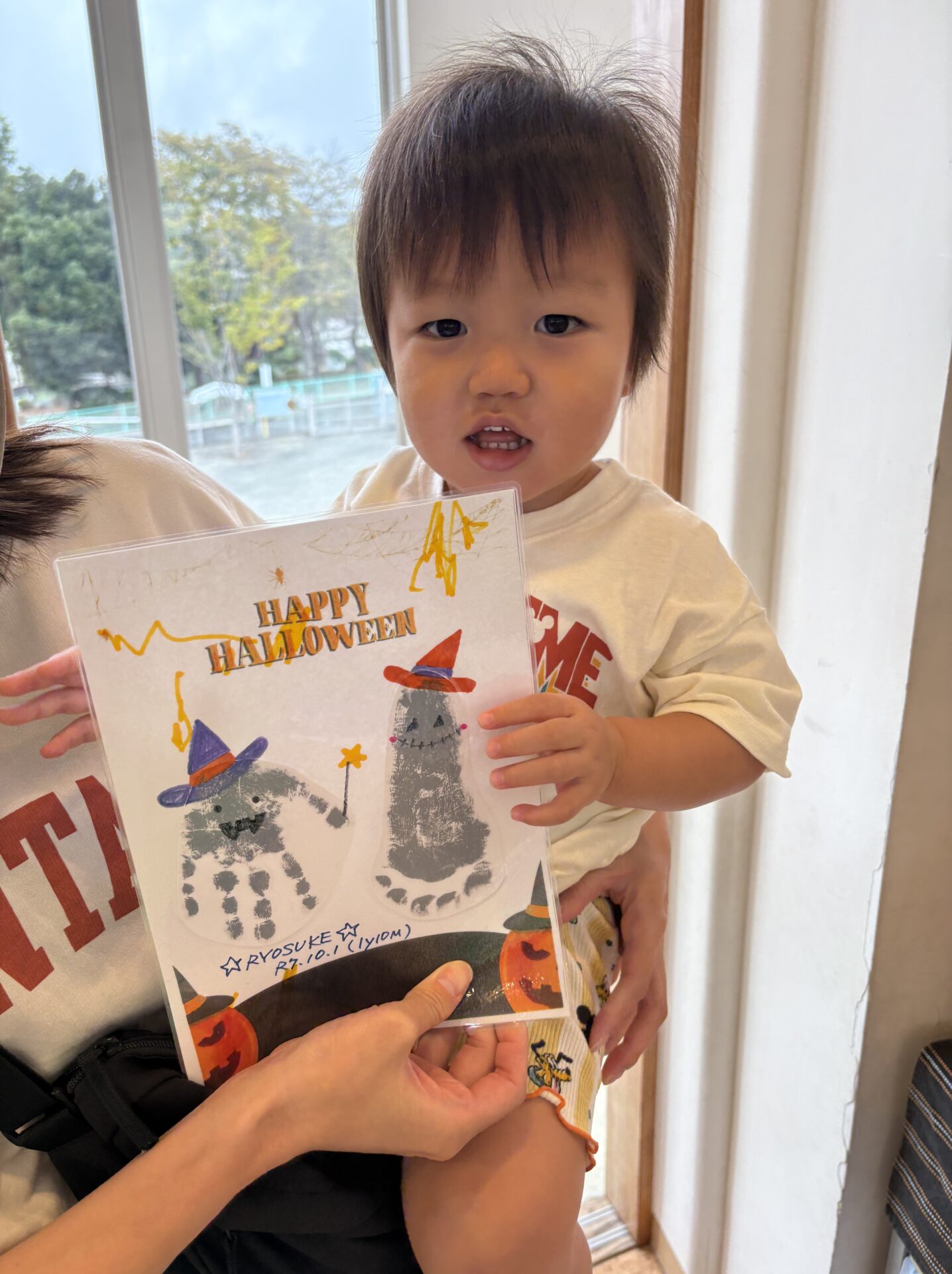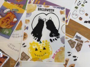 かわいいハロウィンの台紙に手形と足形可愛くできました