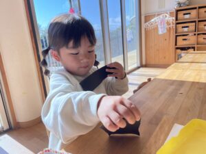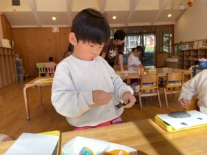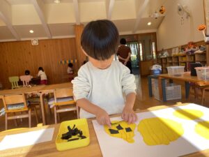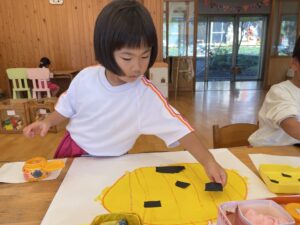 ただただ、小さくちぎるのではなく、どんな形の目や鼻にしようか、考えてからちぎることを約束すると、子どもたちは、「どうしようかなぁ…。」と、大きさや形にこだわりながら、丁寧に取り組んでいました。
