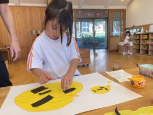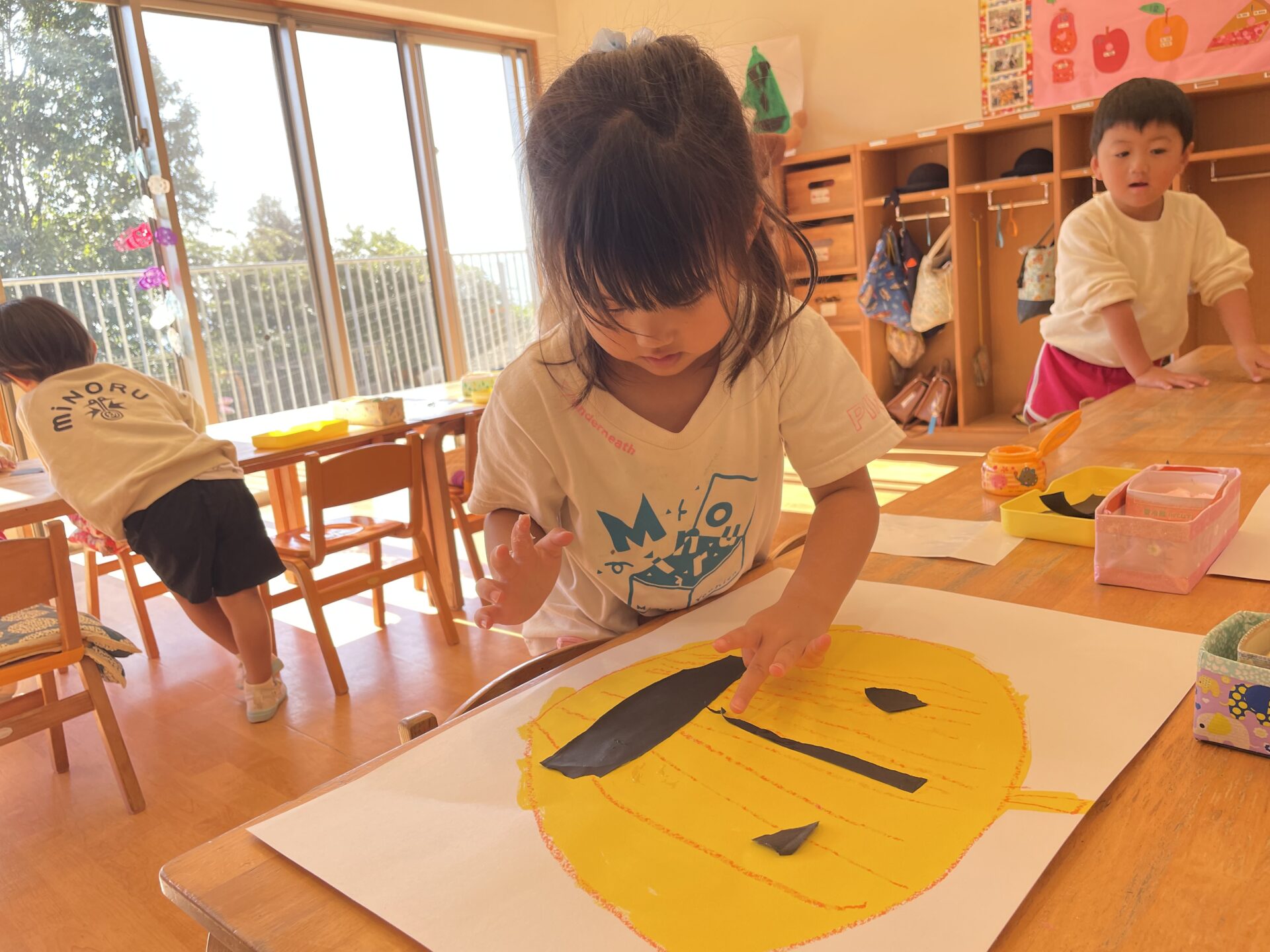 今日は、昨日描いたかぼちゃに、黒い画用紙をちぎって、ジャックオーランタンの表情を作りました。