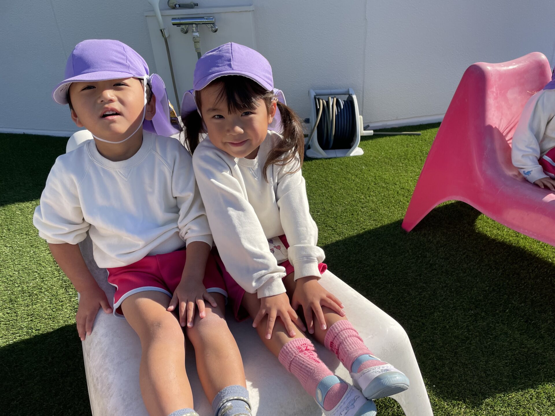 今日、すみれ組では、音楽会の練習の前に、空の園庭でたくさん遊んだね。