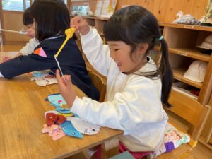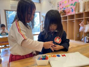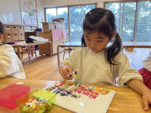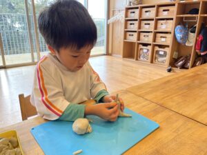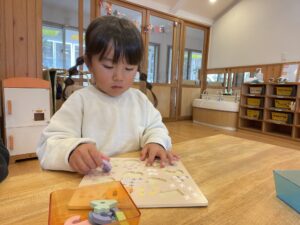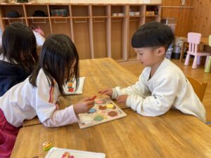 机上で遊ぶおもちゃがやりたいと言い、最初は、全員、粘土遊びをしていたけど、30分程経つと、粘土に飽きてきた子もいたので、パズルや先生の手作りおもちゃをそっと出してあげると、今度はそちらが大人気でした!!