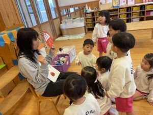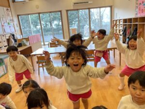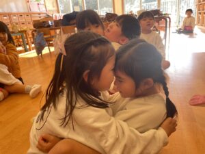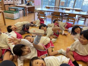 絵本をよみながら、みんなで、だるまさんの真似をして、同じ動きをしてみたね。