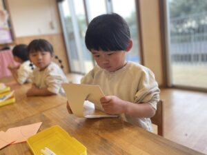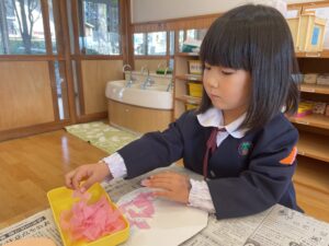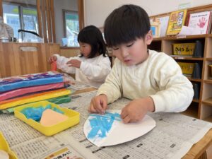 はさみで切った後は、好きな色のお花紙をちぎって貼っていきました。