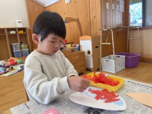 今日、すみれ組では、壁面製作で【だるま】を作りました。