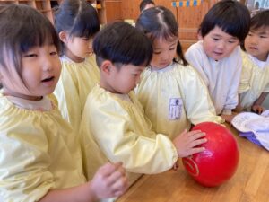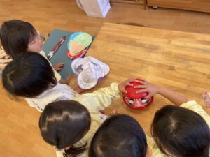 初めて知っただるまさんの秘密に、「だるまさんは、神様のお友だちだね。」と言って、みんなで優しく撫でていた姿がかわいかったよ♡