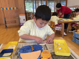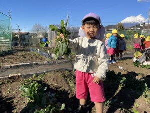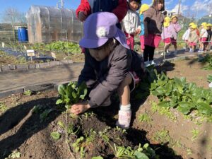 今日、すみれ組さんは、壁面製作の仕上げと、ほうれん草の収穫をしました。