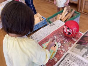 壁面製作では、昨日作っただるまに、顔を描きました。