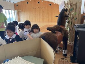 ホールに、お馬さんがいて、順番によしよししたね♡