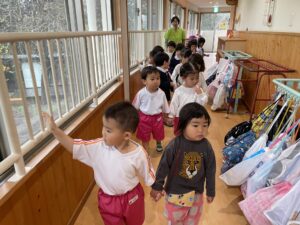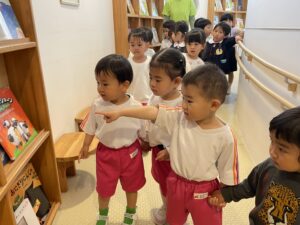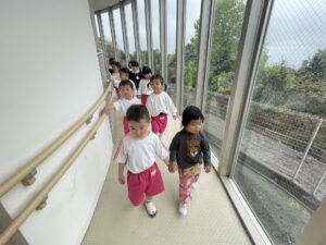 お友だちと手をつないで、みんなで並んで、探検したね。