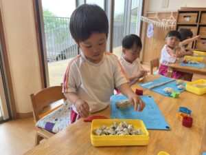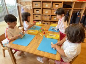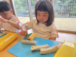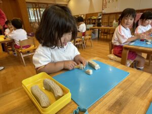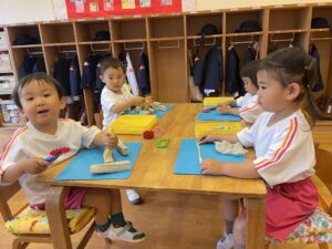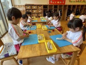さて、今日、すみれ組さんは、粘土遊びをしました。