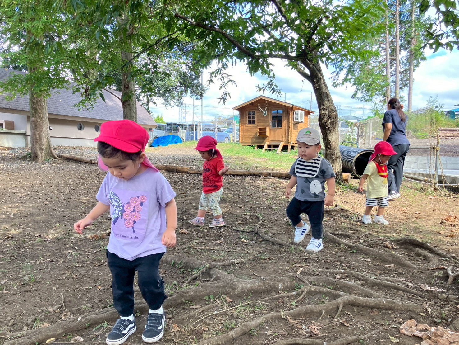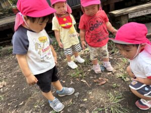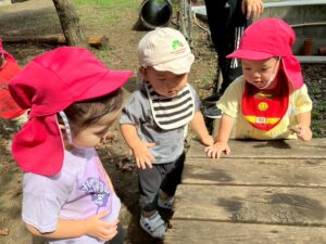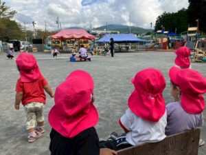 土の園庭では総合遊具で遊んだりお相撲大会の練習を見学したりしました。「頑張れ!」と声をかけたり手を叩いて一生懸命応援していた、りす組さんとうさぎ組さんです🐿️🐇