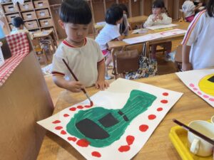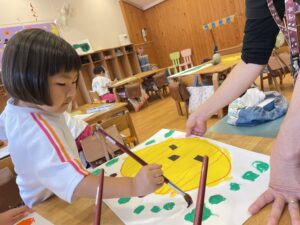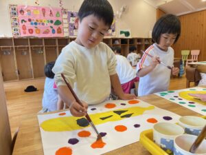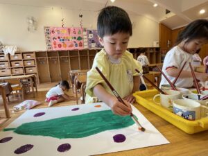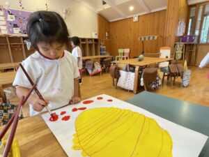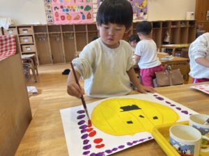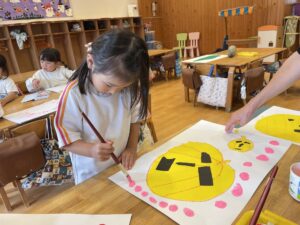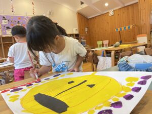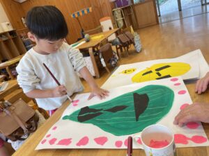 ランチ後は、たんぽぽ組さんは、しずか先生とプレイルームで遊び、すみれ組さんは、お部屋で絵の仕上げをしました。