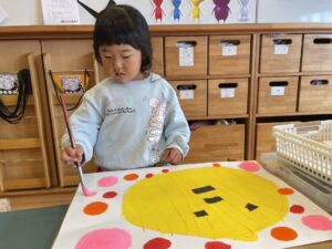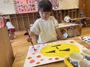 みんな、ドットを飴に見立てて、「ぼくは、ぶどうのあめにするー!」「わたしは、いちごとオレンジー!」などと言って、とっても可愛く、カラフルに描けましたよ♡