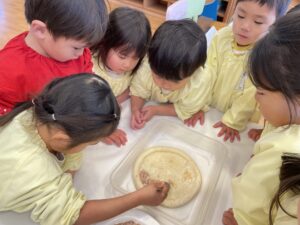 今日、年少組では、昨日、収穫したほうれん草を使って、ピザパーティーをしました。