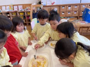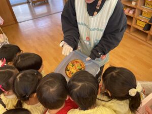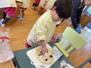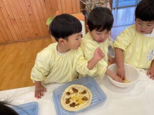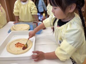 お友だちと相談しながら、仲良く、ピザ作りをしていたね♡
