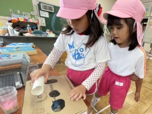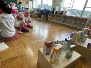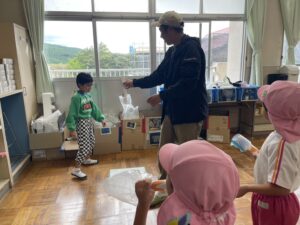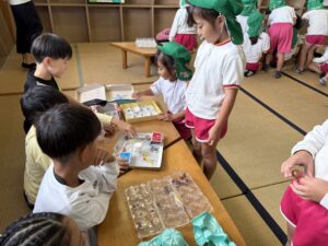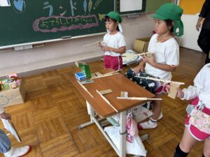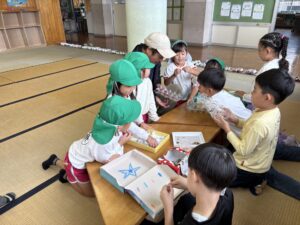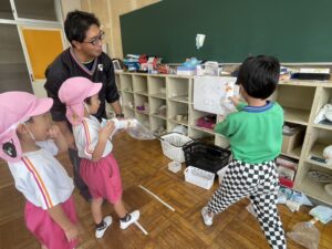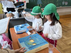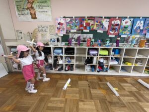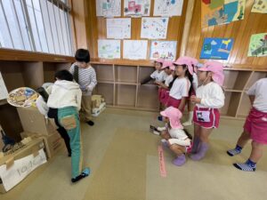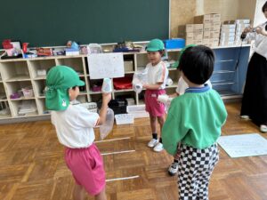幼稚園に来てくれることが多かったけれど、今回は1、2年生のお兄さん・お姉さんがステキな「おもちゃランド」を準備してくれて一緒に遊びました🐟