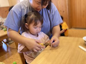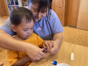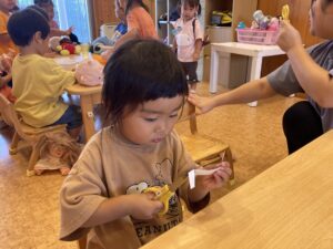 ハサミの穴に指を入れたら、グーパーって指を動かして、チョキンと1回切りにチャレンジしたんだよね😊