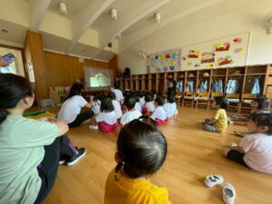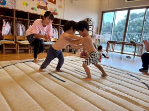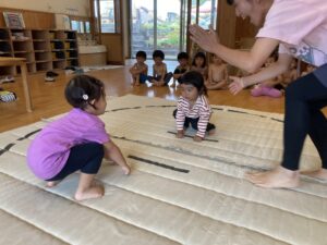 年中さんや年少さんの取り組みを見せて貰ったり、実際のお相撲の映像も見て、やる気まんまんのひつじ組さん💪🏻