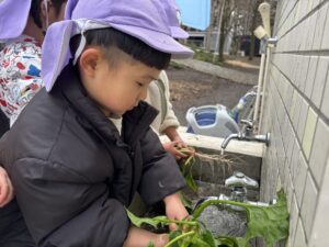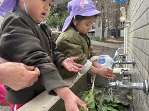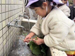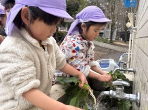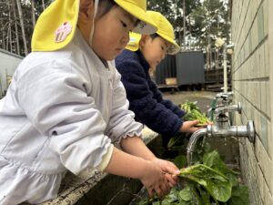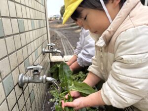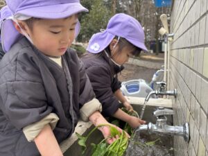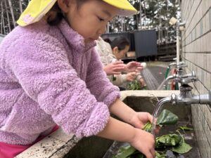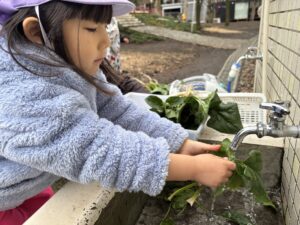 その後、収穫したほうれん草の土をきれいに水で洗ったよ⭐️手が冷たかったけど頑張ってきれいに洗えたね!