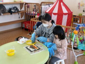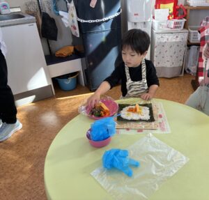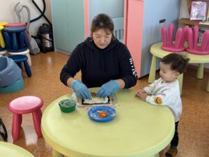 今日のトントゥの日の親子クッキングは、 恵方巻きを作りました! はじめに…恵方巻きのおはなしを聞いて 早速、作りました❗️ 恵方巻きは、節分に縁起が良い方向を向いて 食べる太巻き寿司で、福を巻き込むにちなんで 7種類の具を巻き運を取り込むっていう意味が あるそうです😊 みんなも色んな具をのせて 巻き巻き ギュッギュ! キンパ美味しいね😋 ぜひ、お家でも作ってみてね〜💕 2026年の恵方は、南南東やや南です。 願い事をしながら食べてね❣️