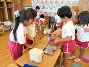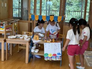 お金を作ったり、名札をトイレットペーパーの芯で作ったりしてお店屋さんごっこを楽しんでいます😊次はどんなお店がオープンするのか楽しみです🙂↕️