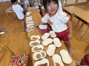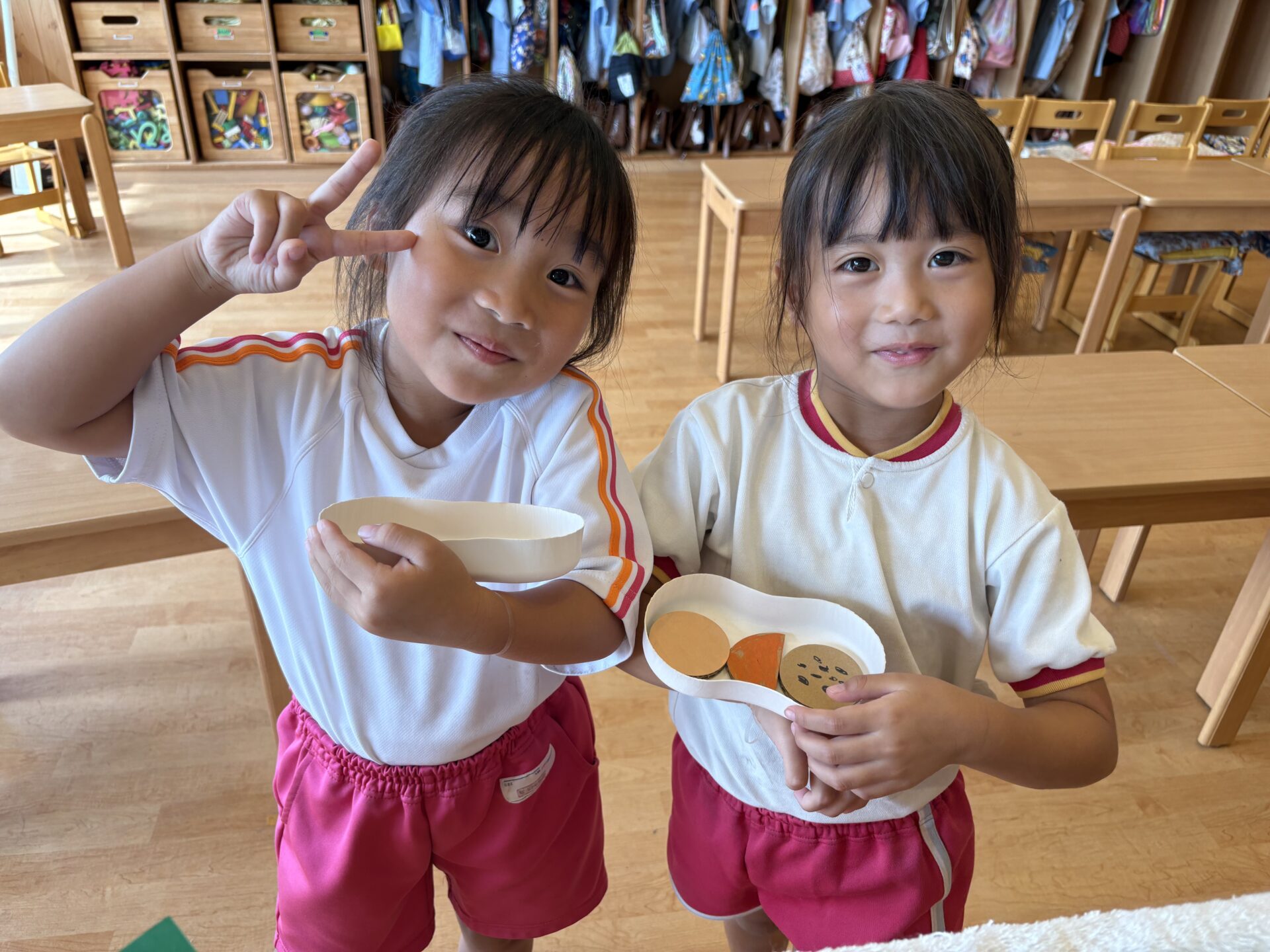 丸などの形のダンボールに模様をかいて、みかん🍊やチョコチップクッキー🍪を作ってクッキー屋さんもオープンしていたり、、