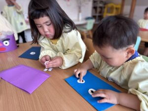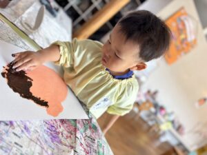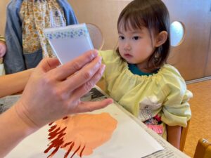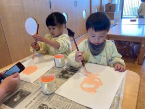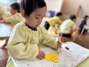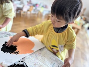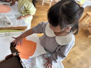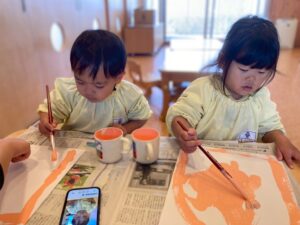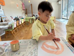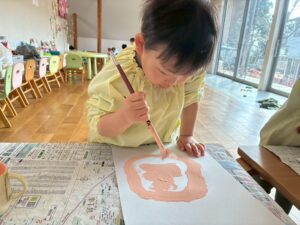 まずはよーく鏡を見て、自分のお顔の色に近い絵の具の色を自分で選び、筆を使って輪郭を描いていきます🖌