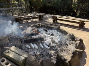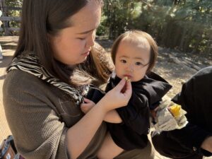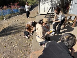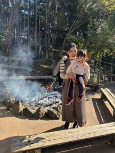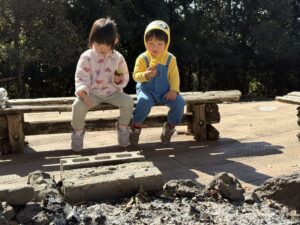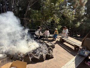 かまどの周りや森の園庭、フォレストハウスに分かれて食べたね