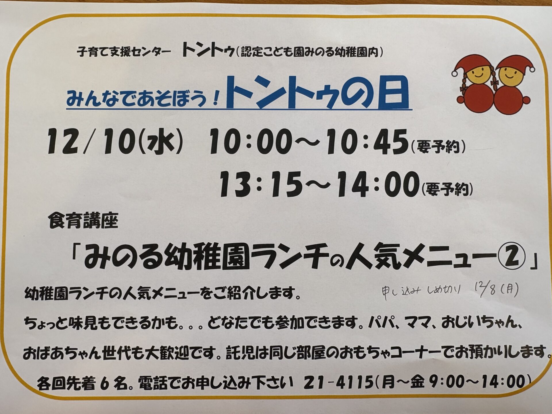 食育講座「みのる幼稚園ランチの人気メニュー②」(トントゥ)